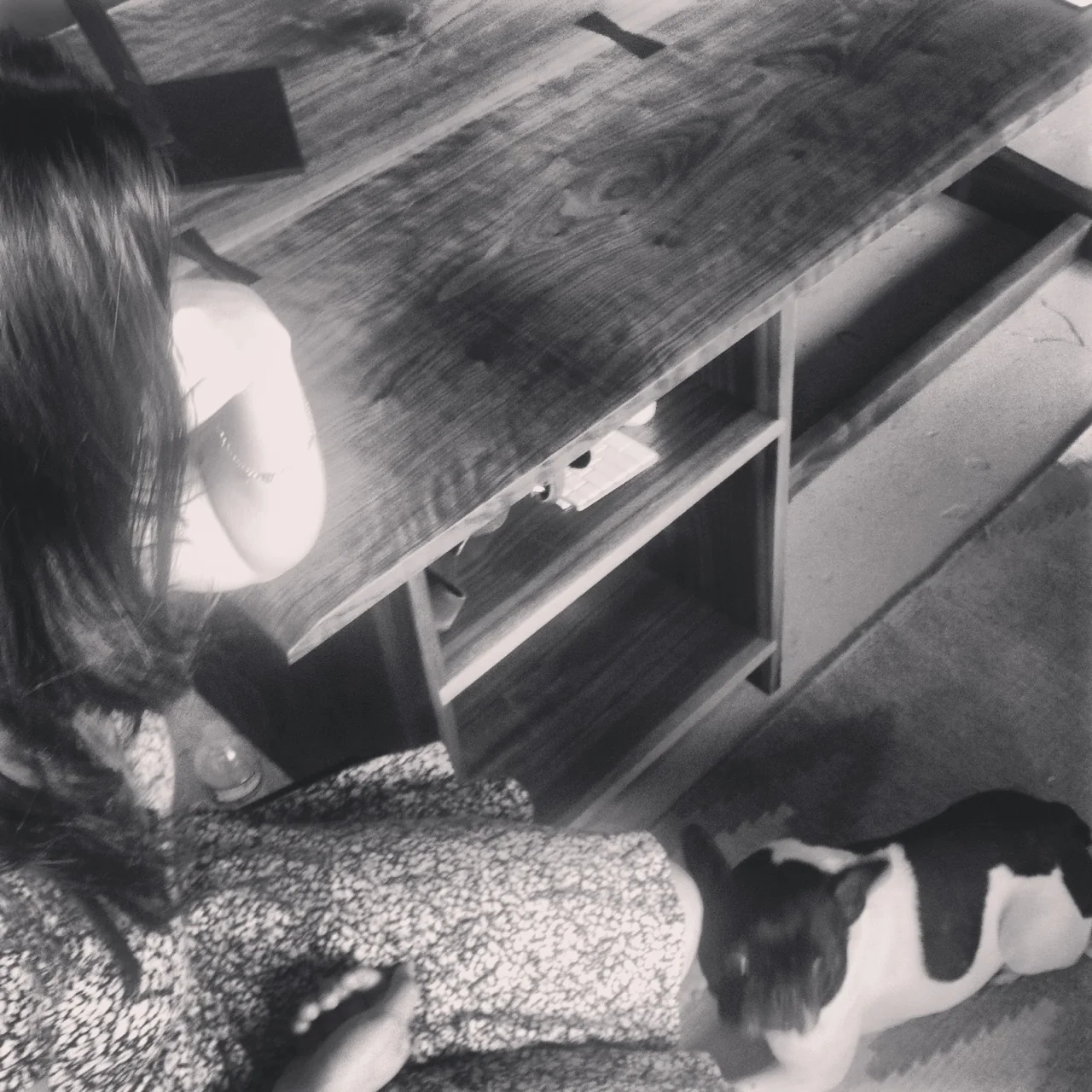 Entirely hand sawn and chiseled, the Tilted Desk features interlocking joinery that allows it to disassemble and reassemble without tools. Solid black walnut is used throughout the piece, with a book matched tabletop joined by Macassar Ebony butterfly keys. Debuted at UniqueLA July 13+14 at the Santa Monica Barker Hangar.